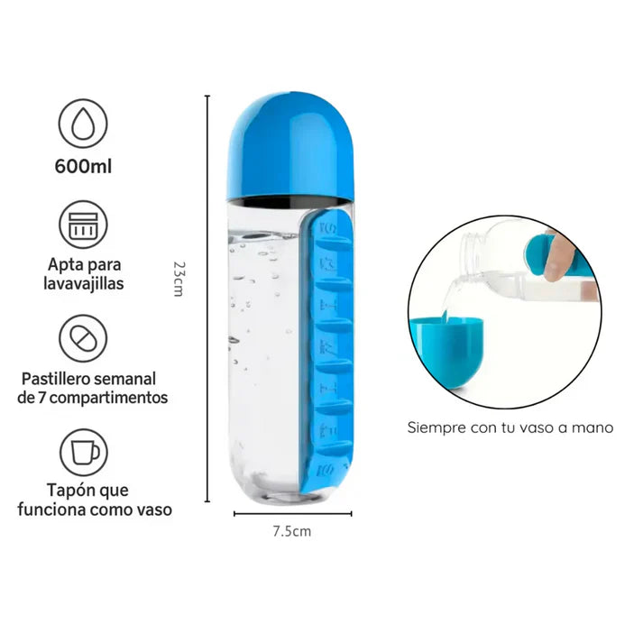 Con esta botella todo en uno, llevas agua, pastillas y taza sin cargar más de la cuenta.